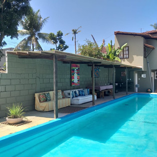 Área externa compartilhada com piscina, lounge e banheiro externo.