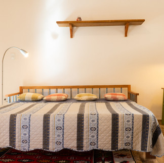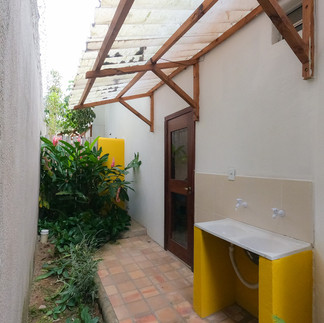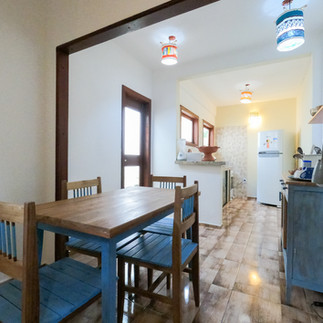 CASA 1: Suíte de casal com possibilidade em colocar uma cama extra de solteiro, sala com sofá cama de casal, cozinha americana, área de serviço e varanda.